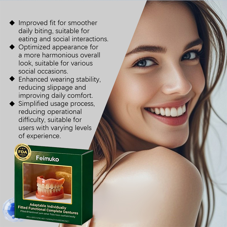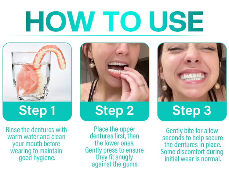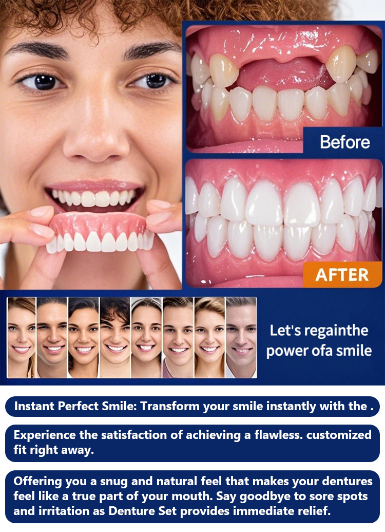 ✅ Adjustable and Natural Design: Adapts to any type of dental arch, discreetly, with a texture similar to natural teeth ✅ Easy to Use: Applies and removes in seconds, no harsh chemical adhesives required ✅ Economical: An alternative to expensive dental treatments, saving up to 70% compared to traditional dentures ✅ Versatile: Ideal for social events, photos, family gatherings, or daily use, resistant to common foods and beverages