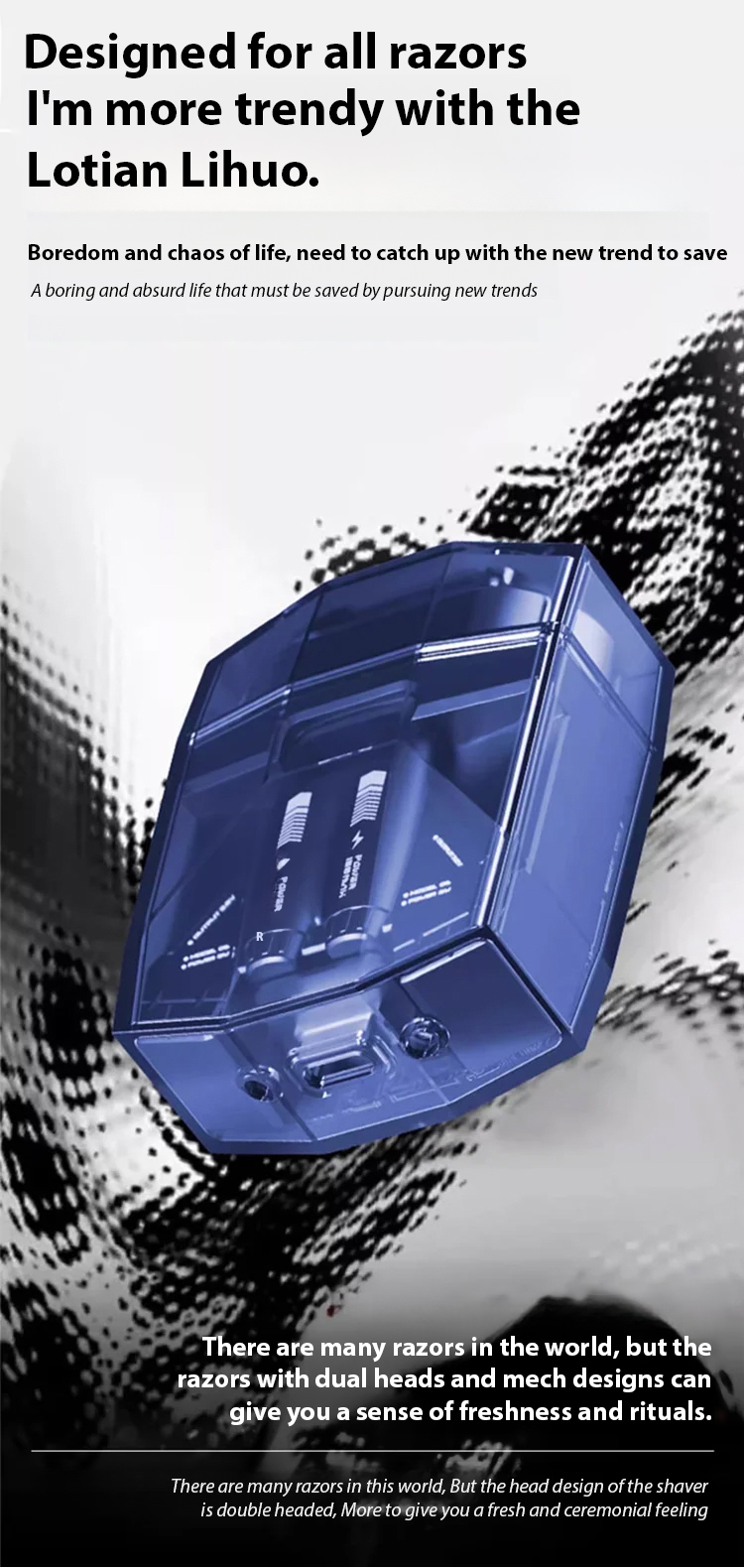 Brand new mecha razor with powerful performance that can even shave copper wires! It can handle both soft and tough stubble, providing a clean shave in one go. Equipped with a high-power motor with torque over 9000 RPM.